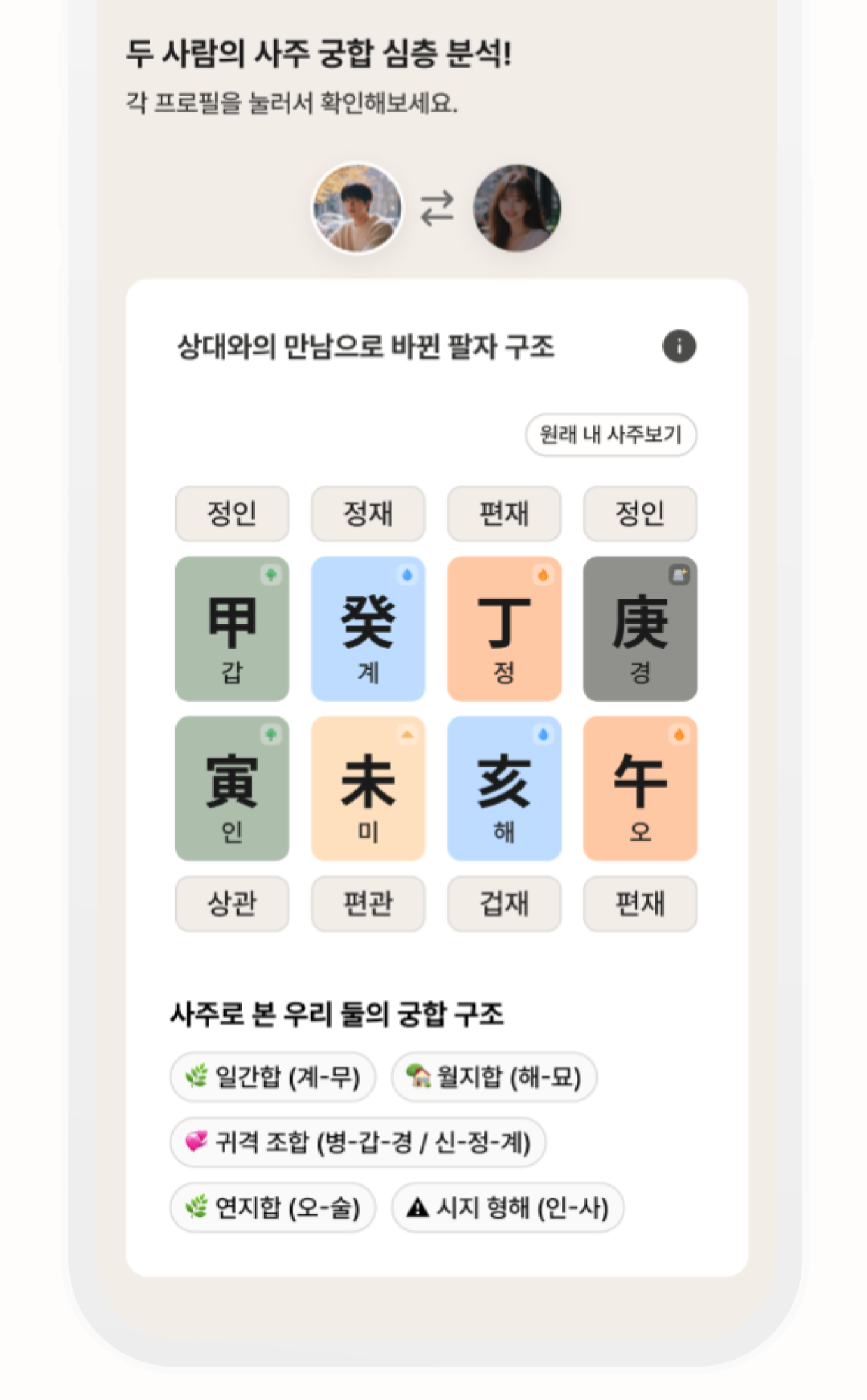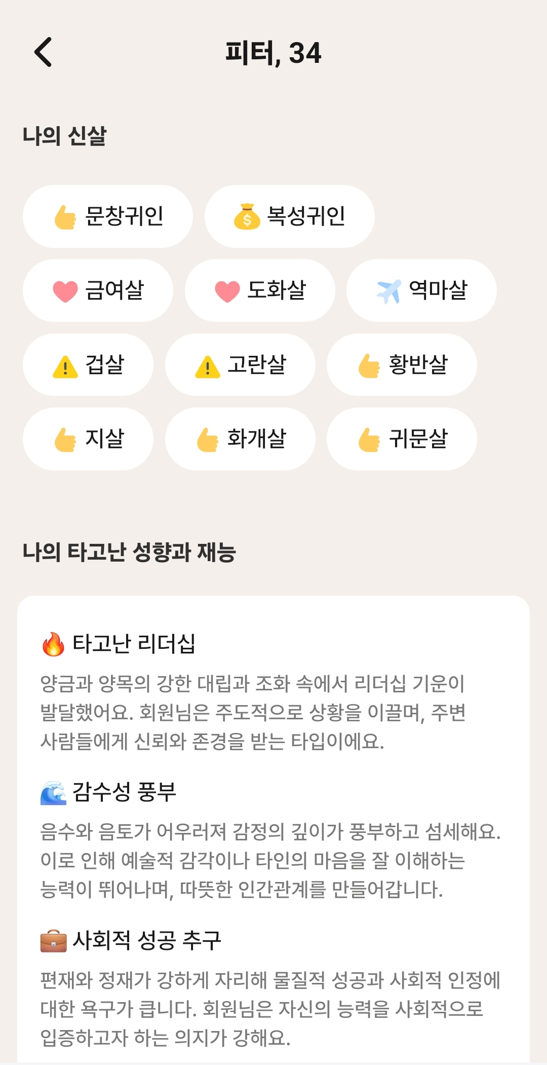 개인 프로필에서는 자신의 신살(神殺)이나 사주 하이라이트를 볼 수 있어요. "역마살이 있어서 여행을 좋아하시겠네요" 같은 가벼운 해석부터, "편인이 강해서 창의적인 일에 소질이 있어요" 같은 진지한 분석까지 다양하게 제공합니다.