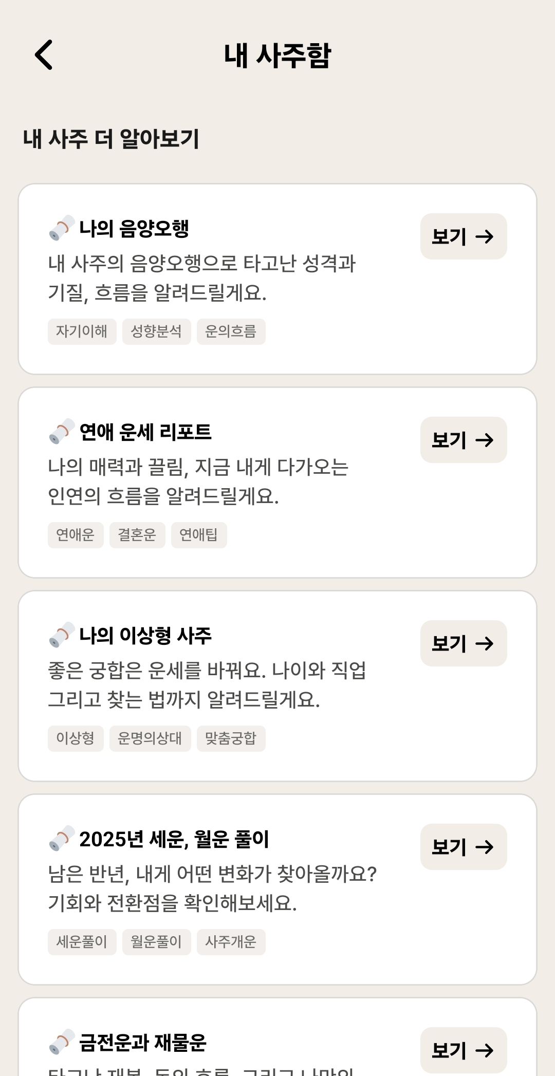 더 깊이 알고 싶은 분들을 위해 '사주함'이라는 기능도 있어요. 본인의 사주에 대한 더 자세한 리포트를 받아볼 수 있죠. 이 리포트 하나하나가 정말 공들여 만든 결과물이에요. AI가 단순히 템플릿을 채우는 게 아니라, 개인의 사주팔자를 종합적으로 분석해서 인생 전반에 대한 맞춤형 조언을 드립니다.