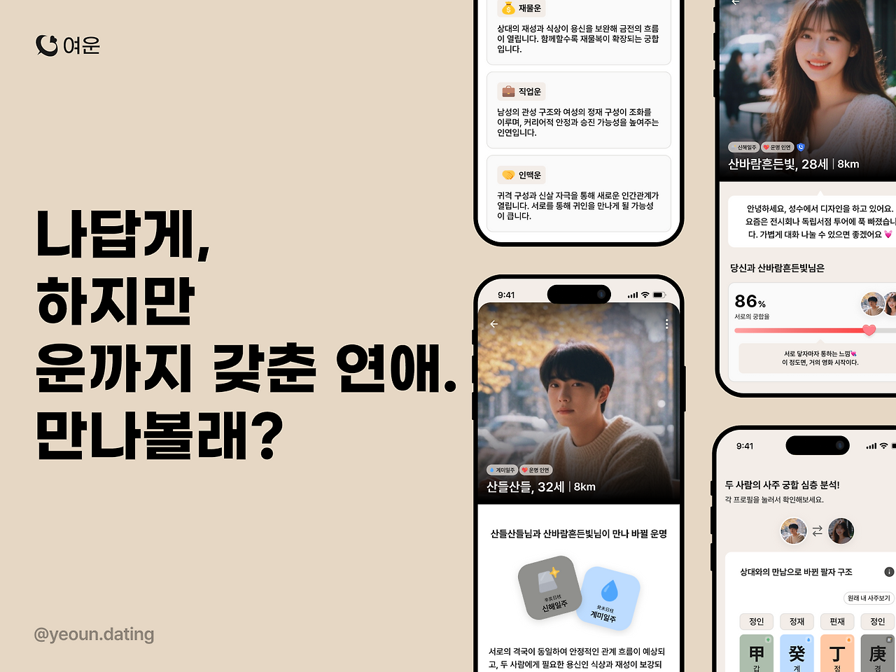 그렇게 '여운'이 탄생했습니다. 단순히 "궁합이 좋다/나쁘다"만 알려주는 게 아니라, 정말 5만원짜리 사주카페에서나 들을 법한 디테일한 분석을 제공한다는 게 핵심이죠. 매칭 하나하나에 정성을 들여, 진짜 '인연'을 찾을 수 있도록 돕고 있습니다.