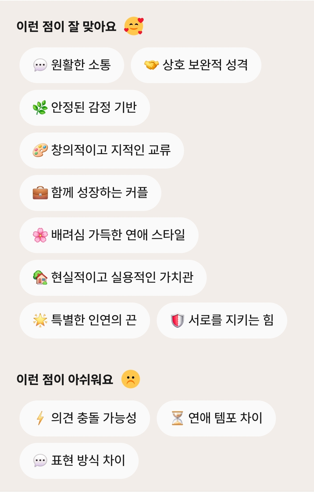 이런 실질적인 정보들을 제공합니다. 막연한 "잘 맞아요"가 아니라, "수(水) 기운이 부족한 당신에게 상대방의 수 기운이 균형을 맞춰줄 거예요" 같은 구체적인 분석이죠.